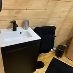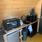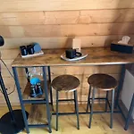 The kitchen amenities at the Cappelle-Brouck accommodation feature an electric kettle, a fridge, and kitchenware, provided in an outdoor dining area.